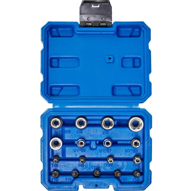 Tekniset tiedot • 1 x bittipidike 3/8 tuumaa - 5/16 tuumaa • 3 x hylsyavain ulkoinen Torx ¼ tuumaa (E6, E7, E8) • 4 x hylsyavain ulkoinen Torx 3/8 tuumaa (E10, E12, E14, E16) • 9 x sisempi Torx 5/16 tuuman rei'ityksellä (TX10, TX15, TX20, TX25, TX30, TX40, TX45, TX50, TX55) • Koko kotelo (LxSxK): 1,5 mm: Materiaali: työkalu kromivanadiiniterästä ja karkaistua terästä, kotelo muovia • Kokonaispaino: 0,5 kg . Toimitus • ulkopuolinen Torx-avainsarja 17 kpl . Huomioi