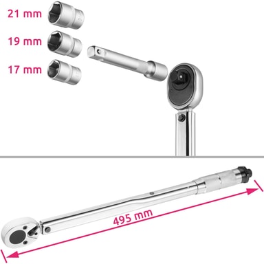 Tekniset tiedot • Momenttiavaimen pituus: n. 475 mm • Ohjaus: ½ tuumaa (12,7 mm neliö) • Toleranssialue: +/- 4 % • Säätöalue: 28 - 210 Nm / 2,9 - 21,4 M-Kgs • Kahvan halkaisija: n. 29 mm • Jatkopään pituus: n. 1,5 - 2,4 M-Kgs • Kahvan halkaisija: n. 29 mm • Jatkopään pituus: n. 125 mm • ½ tuuman pistorasiat: 17, 19, 21 mm • Kotelon mitat (LxSxK): n. 495 x 85 x 65 mm • Paino momenttiavain: n. 1,4 kg • Kokonaispaino: n. 2,16 kg • Materiaali: kromattu hiiliteräs, polyeteeni . Toimitus • 1 työkalupakki • 1 momenttiavain • 1 jatkopala • 3 kiinnitystarviketta . Huomioi