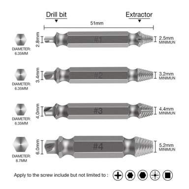 Monipuolinen sovellus: Ruuvinpoistosarja on uskomattoman monipuolinen, sopii ruuvien poistamiseen puusta, metallista tai muovista. Olitpa tekemisissä ruostuneen ruuvin kanssa autossa, kuluneen ruuvin kanssa huonekalussa tai katkenneen ruuvin kanssa elektronisessa laitteessa, tämä sarja kattaa sinut. Sarjaan sisältyvät eri koot varmistavat yhteensopivuuden monenlaisten ruuvityyppien ja -kokojen kanssa. Hiiliteräsrakenne tarjoaa tarvittavan kovuuden tarttua ja poistaa jopa itsepäisimmät ruuvit. Tämä sarja on täydellinen sekä ammattilaisille että tee-se-itse-harrastajille. Kaksipäinen muotoilu yksinkertaistaa prosessia, jolloin voit porata ja poistaa samalla työkalulla. Tämä ruuvinpoistosarja on yhteensopiva sähköporakoneiden kanssa.
