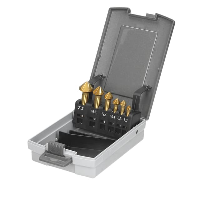 Tekniset tiedot: HSS-poranteräsarja 90°, 6 kappaletta Valmistettu DIN 335 mukaisesti Lomake C HSS - paras pikateräs Upotuskulma 90 3-särmäinen 6 senkkaa, jotka on valmistettu seostetusta työkaluteräksestä koot 6,3, 8,3, 10,4, 12,4, 16,5 ja 20,5 mm. kokonaispituus vaihtelee 4,6 cm:stä 6,3 cm:iin. joiden varren halkaisija on 5 mm - 10 mm Laadukkaasta, karkaistusta HSS-teräksestä valmistettu senkka. Titaanin nitridi Laskujyrsimissä on pyöreä varsi, joten ne sopivat kaikkiin porakoneisiin - akkuporakoneisiin jne.