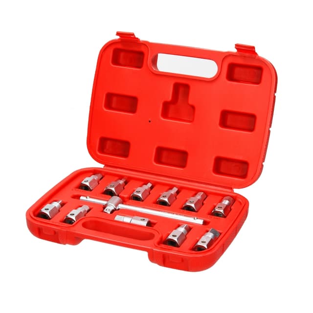Toimituksen laajuus:1x 12-osainen öljypannun hylsyavainTekniset tiedot:Materiaali: kromattu kromivanadiiniteräs.Väri: hopeaSetti koostuu seuraavista osista:1x 8 mm tyhjennystulppia varten kuusikulmaisella hylsyllä varustettuja tulppia varten.Tutustu ominaisuuksiin