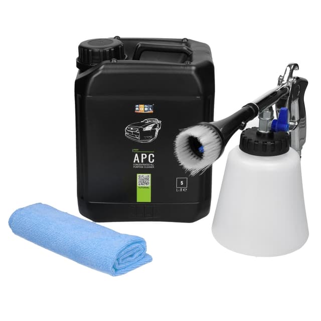 Ammattikäyttöön tarkoitettu paineilmakäyttöinen imukuppipuhdistuspistooli, joka sumuttaa puhdistusnesteet erittäin hienoksi ja pyörittää niitä voimakkaasti paineen alaisena.