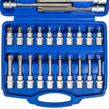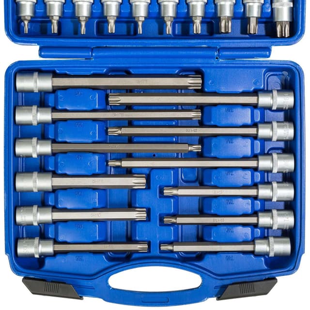 Tectaken suuri, kattava Torx-ruuvipesäsarja, jossa on 32 käytännöllistä osaa autojen, moottoripyörien ja polkupyörien vääntämiseen ja ruuvimeisselityöhön. Korkealuokkaisen valmistuksen ansiosta työskentelet taatusti erittäin tarkasti.
