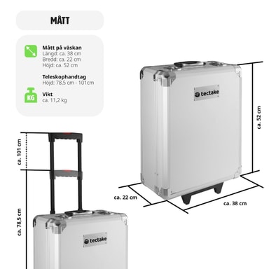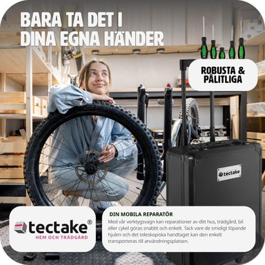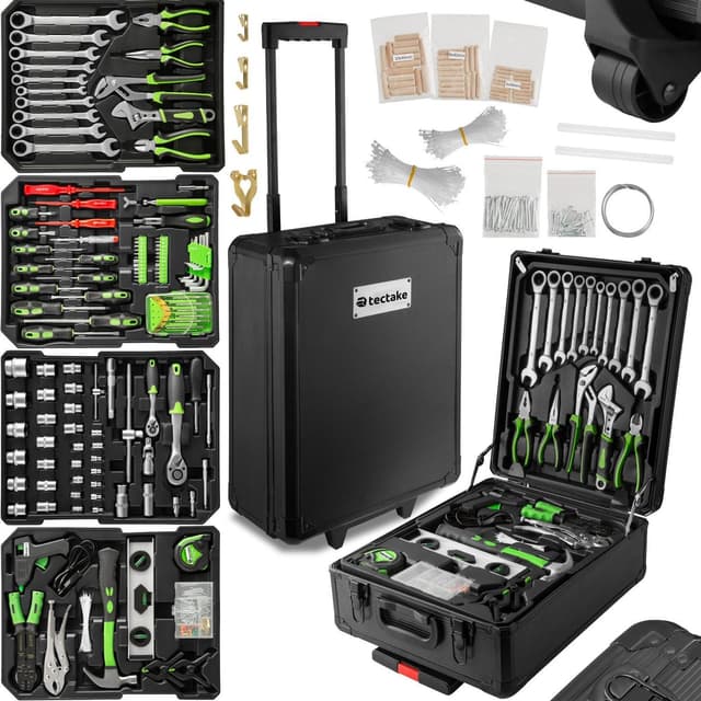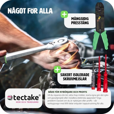 Tämä tectaken vankka työkalulaatikko on täydellinen monitoimilahjakkuus kaikkiin käyttötarkoituksiin kotona, autotallissa tai työpajassa ja niiden ympäristössä. Työkalulaatikossa on neljä tasoa, joissa on suuri valikoima selkeästi järjestettyjä vakiotyökaluja ja tarvikkeita ruuvimeisseleistä rengasavaimiin, pihdeihin ja kuumaliimapistooliin. Työkalujen ergonomiset kahvat mahdollistavat tarkan työskentelyn ja estävät liukastumisen. Paljon työkaluja on järjestetty tilaa säästävällä tavalla neljällä tasolla uriin, jotta työkalut pysyvät paikoillaan työkalulaatikon sisällä. Tämän työkalusarjan vaunu on alumiinivahvistettu ja pitää työkalut ja tarvikkeet turvassa. Työkalulaatikossa on pyörät ja teleskooppikahva, jonka avulla voit vetää ja siirtää työkalulaatikkoa helposti ympäriinsä. Työkalu- ja tarvikesarjamme sopii sekä kotikäyttöön arkeen että ammattilaisille. Säilytettäessä työkalulaatikko on todellinen tilansäästäjä, sillä esine vie vähän tilaa, vaikka siihen mahtuu paljon työkaluja. Aina liikuteltavissa ja käyttövalmiina - tämän tectaken hyvin järjestetyn työkalulaatikon avulla sinulla on aina vankat perusasiat käsilläsi.