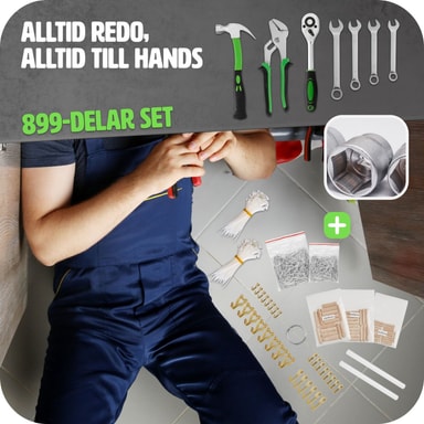 Tekniset tiedot • Kokonaismitat (LxSxK): 37,5 x 21,5 x 51 cm • Paino: 13,9 kg • Materiaali: alumiini, hiiliteräs, termoplastinen kumi (TPR) . Toimitus • 1 Työkalulaatikko 899-osainen Lokero 1 • 1 Neulapihtejä • 1 Sivuleikkuri • 1 Rullavarvasavain • 1 Yhdistelmäpihdit • 1 Vesipumppupihdit • • 10 avokärkistä rengasavainta (19, 17, 15, 14, 14, 13, 12, 11, 11, 10, 9, 8 mm) Lokero 2 • 1 Kynsivasara • 1 Puristuspihdit • 1 Tartuntapihdit • 1 Mittanauha 5 m • 1 Eristysteippi • 2 Muoviliittimiä • 1 Vesivaaka • 1 Kuumaliimapistooli • 2 kuumaliimapatruunaa • 1 Laatikko pieniä osia (nauloja, ruuveja, seinäpidike, ... ) • 1 pakkaus nauloja, seinäpidike ja johto • 240 kaapelisiteitä Lokero 3 • • 1 6-osainen tarkkuusruuvinväännin- Sarja urallinen ja ristikkäis • 1 ruuvimeisseli 6x100 mm urallinen • 1 ruuvimeisseli 3x100 mm urallinen • 1 ruuvimeisseli 3x75 mm urallinen • 1 ruuvimeisseli 5x75 mm urallinen • 1 ruuvimeisseli nirppisarja 6x38 mm urallinen • 1 ruuvimeisseli täysin eristetty 5. 5x125 mm:n ura • 1 Ruuvimeisseli täysin eristetty 4x100 mm:n ura • 1 Ruuvimeisseli täysin eristetty PH 1x100 mm:n ristikko • 1 Ruuvimeisseli PH 3x150 mm:n ristikko • 1 Ruuvimeisseli PH 2x100 mm:n ristikko • 1 Ruuvimeisseli PH 2x100 mm:n ristikko. mm:n poikki • 1 Ruuvimeisseli PH 1x75 mm:n poikki • 1 Ruuvimeisseli PH 0x100 mm:n poikki • 1 Ruuvimeisseli PH 0x75 mm:n poikki • 1 Ruuvimeisseli Knirps PH 2x38 mm:n poikki • 1 Virta- testi- Ruuvimeisseli • 1 Ratasruuvimeisseli, jossa on bittipidike • 1 Magneettinen bittipidike • 1 Kuusiokantainen hylsysarja (10, 8, 6, 5, 4, 3, 2. 5, 2, 1. 5) • 1 bittisarja ura, ristikko • 1 bittisarja kuusiokolo, Torx • 1 sauvamagneetti • 1 koukkuavain Lokero 4 • 1 ½ tuuman räikkä • 1 ¼ tuuman räikkä • 1 ¼ tuuman ruuvimeisseli • 1 T-kiinnike ½ tuumaa • 1 T-kiinnike ¼ tuumaa • 17 ½-tuuman mutterit (30, 27, 24, 23, 22, 21, 20, 19, 18, 17, 16, 15, 14, 13, 12, 11, 10 mm) • 12 ¼ tuuman mutterit (13, 12, 11, 10, 9, 8, 7, 6, 5. 5, 5, 4,5, 4 mm) • 1 jatkopala ½ tuumaa • 1 jatkopala ¼ tuumaa • 1 lyhyt jatkopala ¼ tuumaa • 1 joustava jatkopala ¼ tuumaa • 1 yleisnivel ½ tuumaa • 1 yleisnivel ¼ tuumaa • 2 sytytystulppapistokepistorasiaa (21, 16 mm)