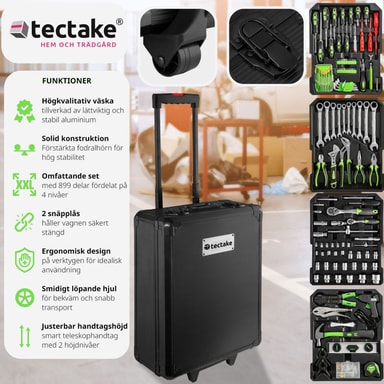 Kohokohdat • Alumiininen työkalulaatikko, jossa 898 kappaletta • Kompakti työkalulaatikko, jossa 4 tasoa • Helppo liikutella pehmeiden pyörien avulla • Säädettävä teleskooppikahva kahdella korkeusvaihtoehdolla • Vakaa rakenne • Teräsvahvistetut kulmat • Kaikki työkalut ergonomisella muotoilulla täydellisen tuntuman ja optimaalisen voimansiirron takaamiseksi • • Työkalujen kuvitetut ääriviivat helpottavat lajittelua käytön jälkeen • Färg: musta