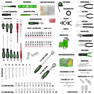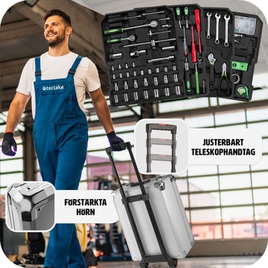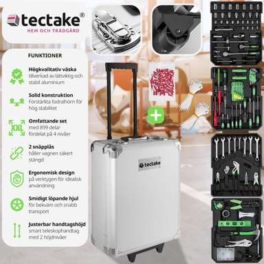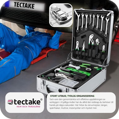 Tämä tectaken työkalulaatikko on jokaisen DIY-fanin unelmien täyttymys. Kaikki vakiotyökalut on järjestetty selkeästi neljälle tasolle, mukaan lukien valikoima ruuvimeisseleitä ja kiintoavaimia sekä suuri räikkäsarja.