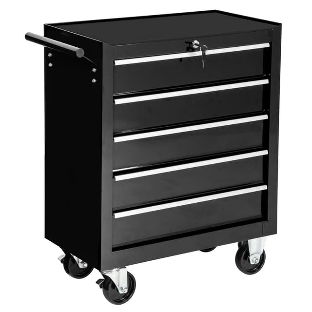 Kohokohdat • Viisi lukittavaa, tilavaa laatikkoa • Kuulalaakeroidut liukukiskot • Laatikoissa ja säilytyspinnalla liukumattomat matot • Neljä tukevaa pyörää mahdollistavat liikuteltavuuden ja helpon liikuttelun • Kaksi seisontajarrua pyörissä • Kaksi kääntyvää pyörää • Vankka työkaluvaunu • Käytännöllinen kahvatanko, joka voidaan asentaa tarpeen mukaan vasemmalle tai oikealle puolelle • Pulveripinnoitettu pinta takaa vähäisemmän alttiuden naarmuille ja korroosiolle . • Färg: musta