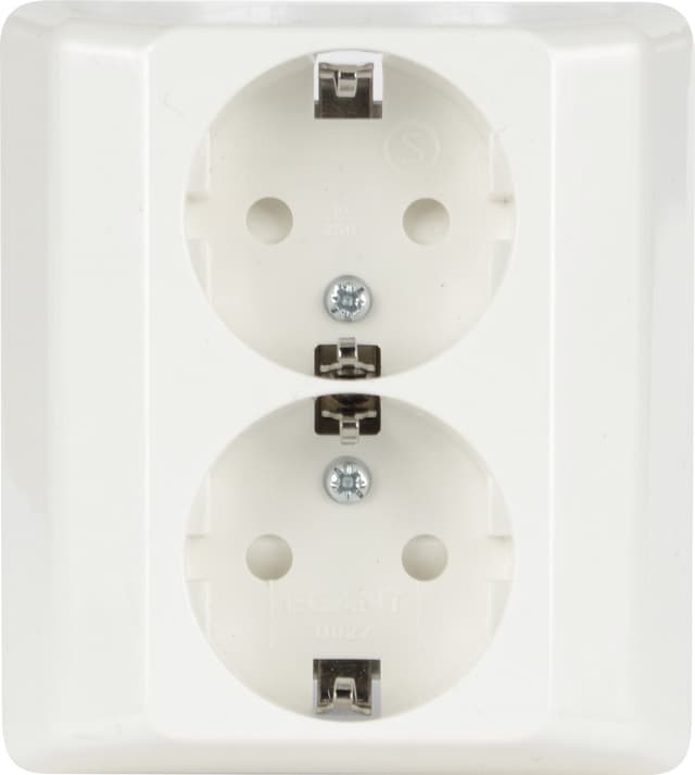 2-paikkainen Nordic Quality -pistorasia verkkovirralle kytkettäville laitteille. Pistorasia on suunniteltu Uppoasennuksille enintään 250 V verkkojännitteelle 16 A virralla, ja siinä on myös paikka maajohdolle.