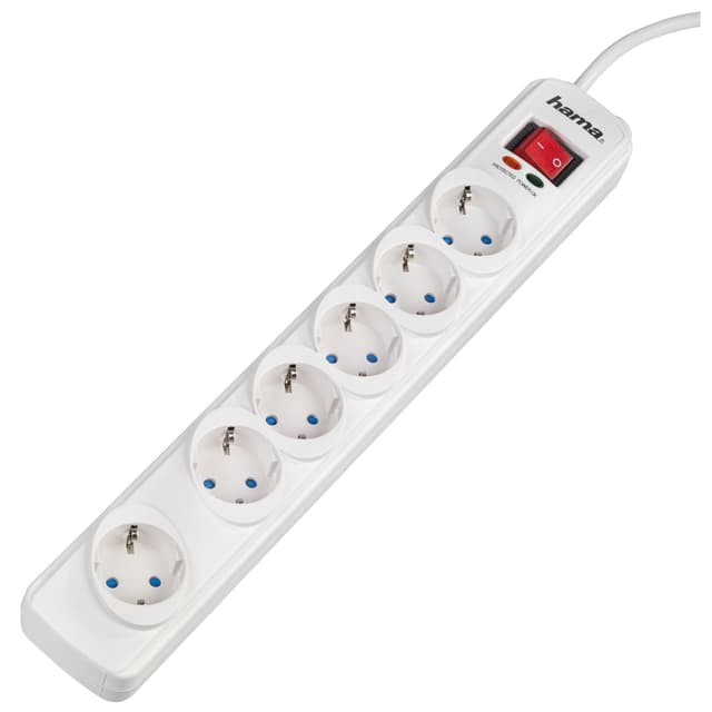 6-osaisessa Hama-jatkojohdossa on kaksinapainen virtakytkin ja ylikuumenemista ehkäisevä ylijännitesuoja. Melusuodatin vähentää sähkömagneettisia häiriöitä. Pistokepaikat ovat 45 asteen kulmassa.