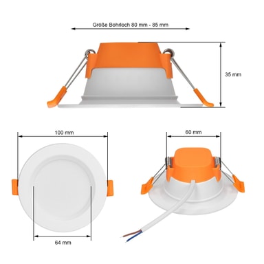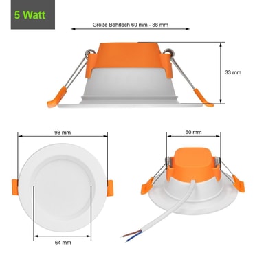 Toimituksen laajuus:5 x LED uppoasennusvalaisin 5W lämmin valkoinenTekniset tiedot:Valovoima: 350 LmTeho: 5WReikäleikkaus: noin 60 mmSädekulma: 90Asennussyvyys: noin 33 mmMuoto: pyöreäValaisimen mitat (KxS): noin 104 x 50 mm.Valon väri: