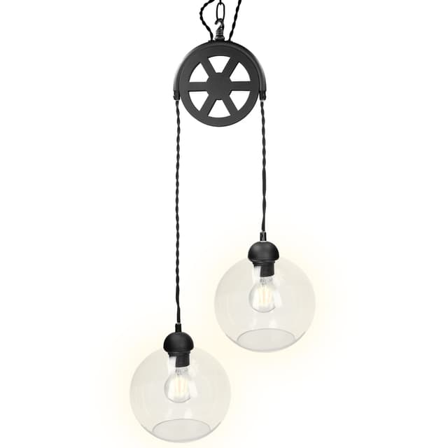 Tämä maalaismainen riipusvalaisin osoitteesta ECD Germany tuo kotiisi täydellisen retroilmeen. Valaisin, jossa on kaksi suurta lasipalloa ja kiristyspyörä, on tyypillinen teollisen muotoilun malli. Kaapeleissa on laadukas tekstiilivaippa, joka korostaa entisestään valaisimen retroilmettä.