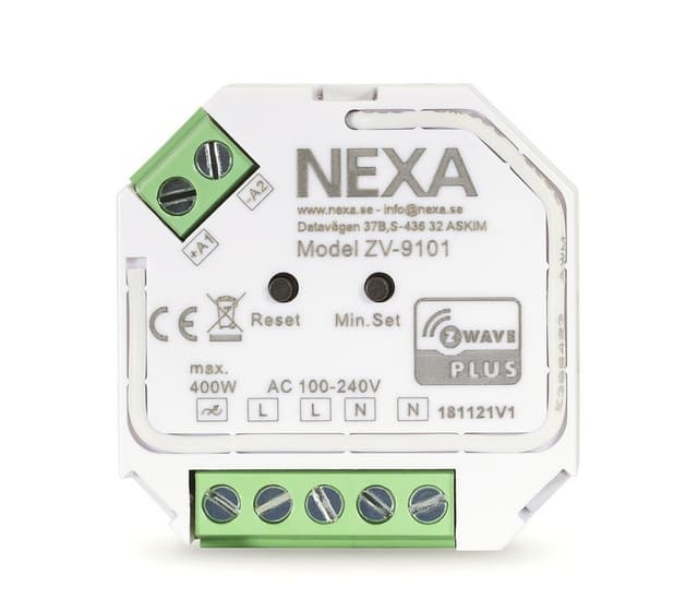 Sisäänrakennettu Z-Wave Plus himmennin kiinteään asennukseen, joustavan kytkimen tulo. Säädettävissä etureunan ja takareunan ohjaaman vaiheen himmentämisen välillä, samoin kuin säätö alhaisimmalle himmentimen tasolle.