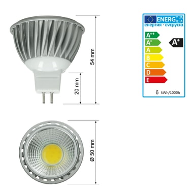 Toimituksen laajuus:6 x LED COB lamppu neutraali valkoinenTekniset tiedot:Lampunpidin: MR16Sädekulma: 120Virrankulutus: 6WKäyttöjännite: 12V DCVärilämpötila: neutraali valkoinen - 4000 KValovoima: 550 lumeniaKorvaa 40W halogeenilampunEnerg