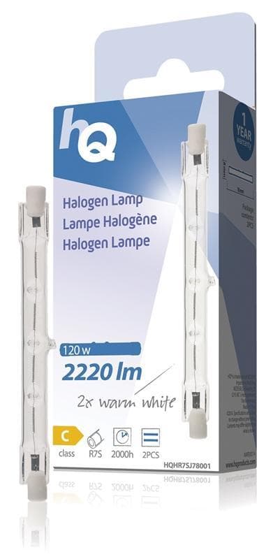 J78-halogeenilamppu, jossa on R7S-kanta, 2 220 luumenin valoteho ja 120 watin virrankulutus. Lamppu antaa lämpimän valkoista valoa, jonka värilämpötila on 2,800 Kelvin-astetta. Yhden laatikon hinta. Yhdessä laatikossa on 2 lamppua.