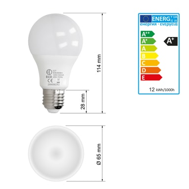 Toimituksen laajuus:1 x 12W E27 LED-lamppu lämpimän valkoinenTekniset tiedot:Valmistaja/malli: E27 LED-lamppuEnergiatehokkuusluokka: A+Valovoima: 800 lumeniaKulutus watteina: 12 WattSädekulma: 270Elinikä tunteina: 50,000 tuntiaVäri: lämmin