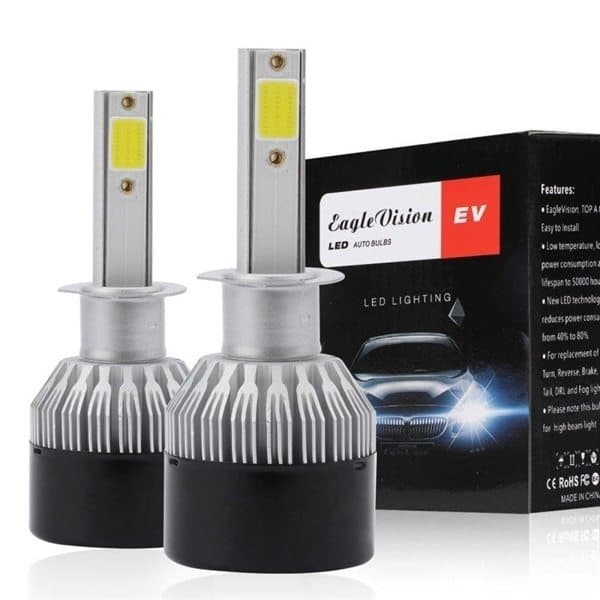 Pakkaus, jossa on 2 kpl energiatehokasta LED-ajovalopolttimoa autoon alhaisemmalla virrankulutuksella kuin halogeenipolttimot.