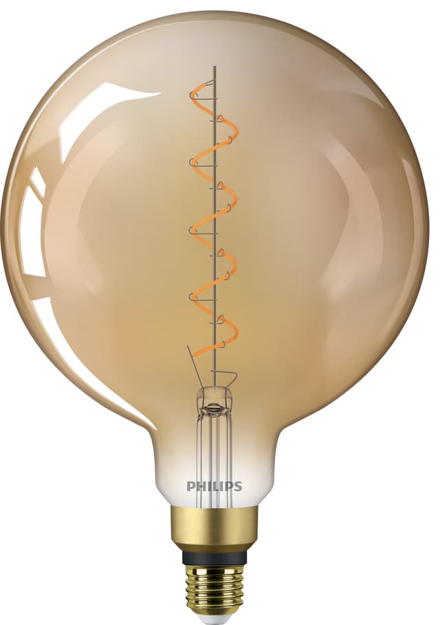 Philips Giant -LED-lamppu antaa tyylikkään lisän valaistukseesi näkyvän hehkulangan ansiosta, ja sen erittäin lämmin valo täyttää huoneesi kodikkaalla tunnelmalla. LED-lamppu on myös energiatehokas.