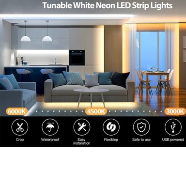 Säädettävä kirkkaus: Koe saumattomat valaistussäädöt kosketusherkän himmentimen avulla. Tämän ominaisuuden avulla voit vaivattomasti säätää 6500K valkoisen neon LED-nauhan kirkkautta ja luoda täydellisen tunnelman mihin tahansa ympäristöön. Tarvitsetpa kirkasta valaistusta yksityiskohtaisiin tehtäviin tai pehmeää hehkua rentoutumiseen, kosketushimmennystoiminto tarjoaa monipuoliset valaistusvaihtoehdot. Ihanteellinen makuuhuoneisiin, olohuoneisiin tai työtiloihin, tämä LED-nauha tarjoaa mukautettavan valaistuksen tarpeisiisi. Intuitiivinen kosketusohjaus varmistaa helpon käytön, mikä tekee siitä käytännöllisen ja tyylikkään lisäyksen mihin tahansa tilaan. Nauti valon voimakkuuden säätämisen helppoudesta yksinkertaisella kosketuksella, mikä parantaa yleistä valaistuskokemustasi.