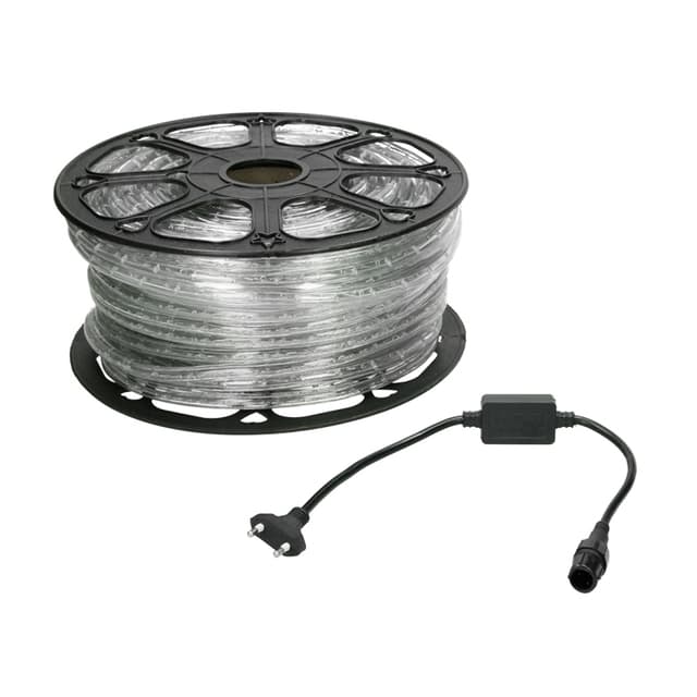 1 x 30 m keltainen LED-valoletku asennetulla verkkolaitteella ja päätykannilla.