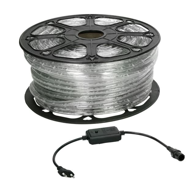 1 x 50 m LED-köysivalo RGB / värillinen, jossa on asennettu virtalähde ja päätykappaleet.
