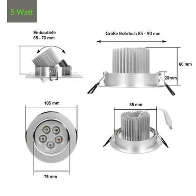 Toimituksen laajuus:5 x 5W lämpimän valkoiset LED-valonheittimet.Tekniset tiedot:Valovoima: 353 lumeniaVastaavuus halogeeniin: noin 30 WTeho: 5 WReikäleikkaus: noin 85 mmAsennussyvyys: noin 65 - 70 mmPaino: noin 174 gValaisimen mitat: noin