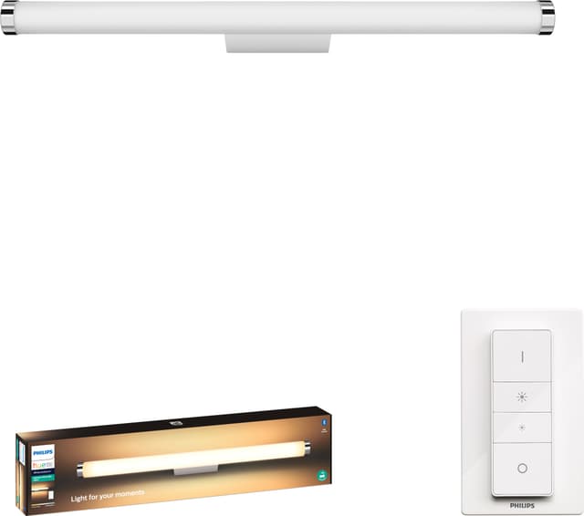 Himmennä valaistus sopivaksi mukana toimitettavan himmennyskytkimen avulla. Voit sijoittaa sen seinälle tai käyttää sitä kaukosäätimenä irrottamalla sen telekastaan. Valitse esiasetettu valaistusasetus tai himmennä valoa mielesi mukaan. Paristokäyttöinen himmennyskytkin voidaan yhdistää jopa 10 Philips Hue -valaisimeen.