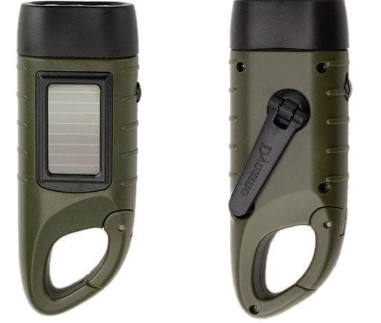 Pieni ja kätevä taskulamppu, jota voi ladata joko käsikammella tai mukana tulevalla USB-kaapelilla.