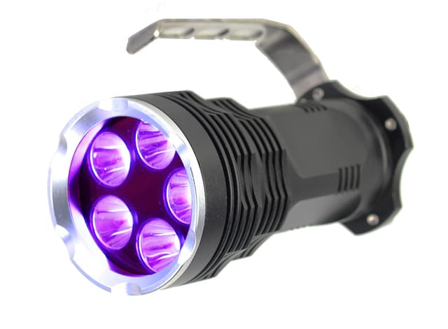 UV-taskulamppu, jossa on 5x6 watin LED-diodit Tehokas UV-taskulamppu 30 wattia - 395nm 5 x 6 watin suuritehoiset LED-diodit. Voi valaista jopa 60 meters pimeässä. Tehokkaalla UV-valolla voidaan skannata alue epäpuhtauksien varalta. Tämä voi olla mikrobeja suuressa akvaariossa, virtsaa tai muita asioita, jotka eivät näy paljaalla silmällä. Mukana 4 x ladattavat litium 18650 -paristot. Laturi mukana Pöly- ja vedenpitävä (IPX6) Pituus: 150 mm Pään halkaisija: 70 mm Materiaali: alumiiniseos LED-diodien käyttöikä: 50.000 tuntia.
