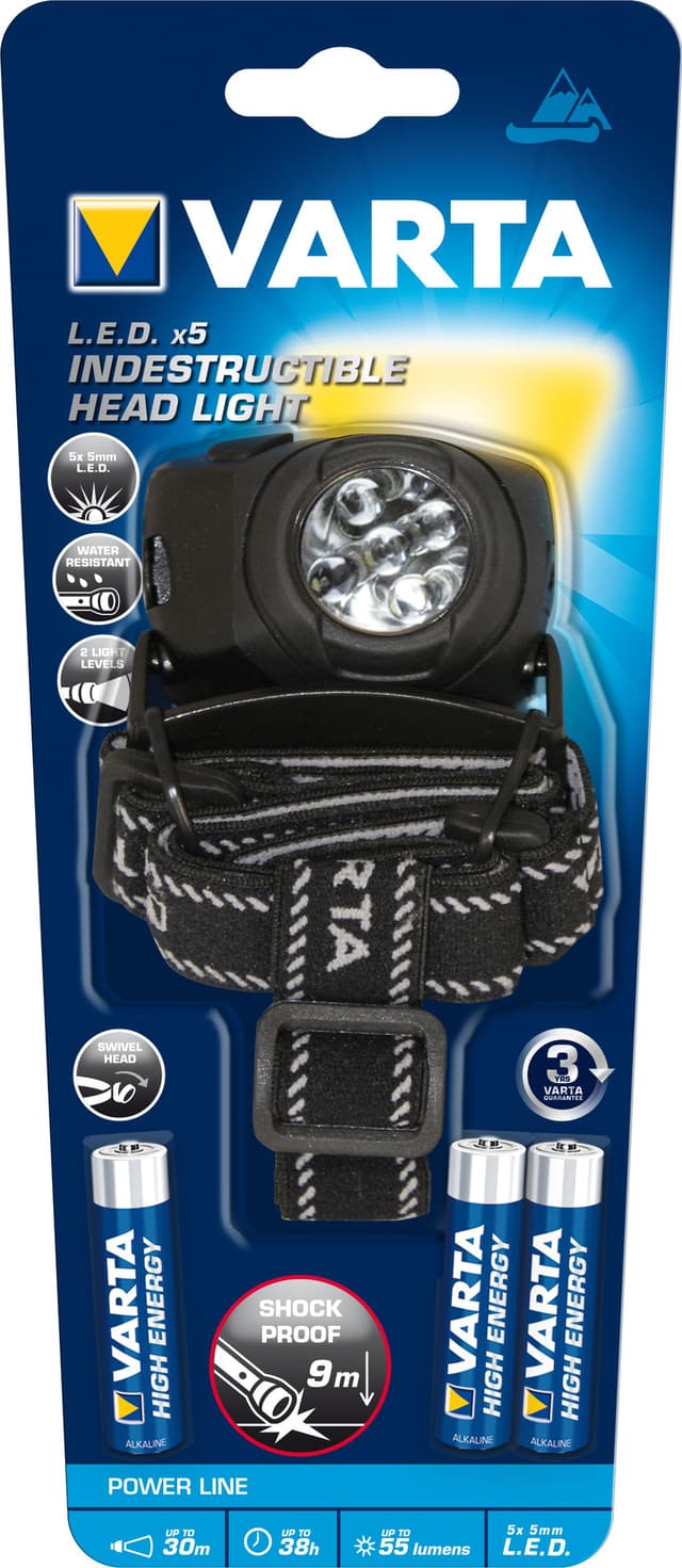 Varta 5x LED otsalamppu 3AAA  on erittäin vahvarakenteinen ja vedenkestävä (IPX4). Kaksi säädettävää valonvoimakkuutta. Valaisee jopa 100 metriin asti.