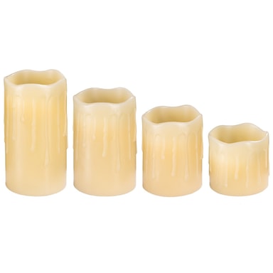 Tekniset tiedot Ø 7,5 cm, korkeus: 7,5 cm / 10,5 cm / 12,5 cm / 15,5 cm • • kynttilää kohden tarvitaan paristoja: Ø 7,5 cm, korkeus: 7,5 cm / 10,5 cm / 12,5 cm / 15,5 cm • kynttilää kohden tarvitaan paristoja: Kaikki kynttilät yhteensä n. 850 g • väri: kermanvalkoinen materiaali: • kermanvärinen kynttilänsuojus aidosta vahasta • osat muovia ja metallia . Toimitus • LED-kynttilöitä 4 kpl (ilman paristoja) • 1 kaukosäädin sis. pariston (CR2025 3V) • 1 ohje