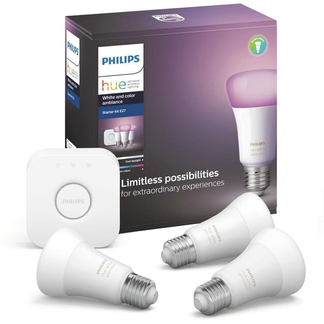 Philips Hue White and Colour Ambiance sisältää kolme lamppua ja sillan. Muuta valaistuksesta ainutlaatuinen kokemus valkoisella ja värillisellä valolla. Synkronoi se musiikin, TV: n ja pelien kanssa saadaksesi mukaansatempaavan kokemuksen.