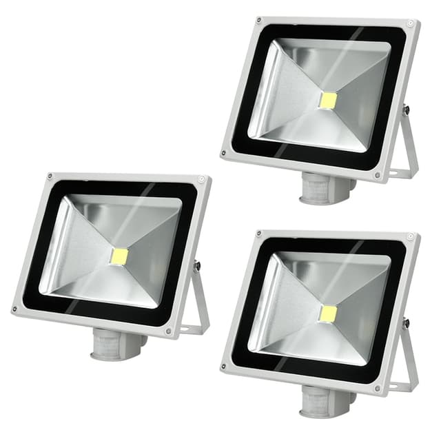 Toimituksen laajuus:3 x 50W SMD LED-valonheitin liiketunnistimella Lämmin valkoinen 2800K.Tekniset tiedot:Suojausluokka: IP65 (suojattu vesisuihkuilta)Kotelo: ruiskuvalettua alumiiniaSädekulma: noin 120Jännite: 220-240V ACTeho: 50WTehonkulut