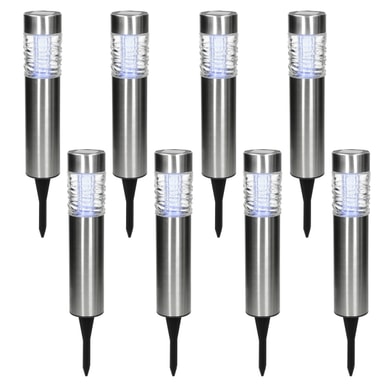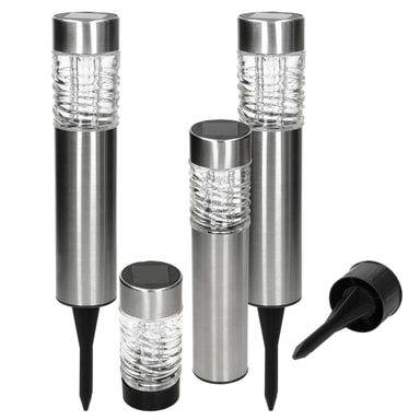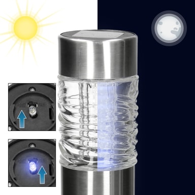 Luo oma yksilöllinen tunnelmasi puutarhaan tai parvekkeelle langattomasti tällä kauniilla 8 LED-aurinkovalaisimen sarjalla. Säänkestävästä ruostumattomasta teräksestä ja lasista valmistetut valaisimet on varustettu nykyaikaisella aurinkotekniikalla ja pitkäikäisillä LED-valoilla. Ne latautuvat päivällä ja säteilevät varastoitua valoa uudelleen, kun tulee pimeää. Suojausluokan IP44 ansiosta ne ovat roiskevedenpitäviä ja siksi ihanteellisia ulkokäyttöön.