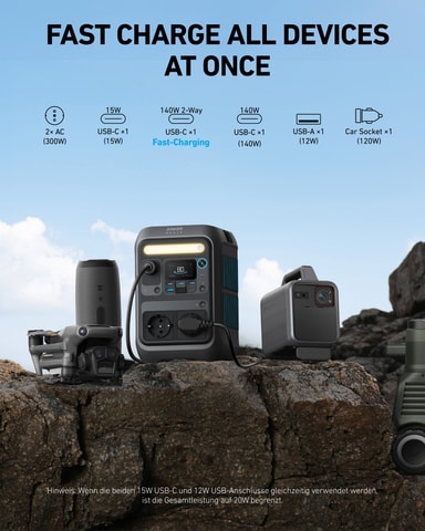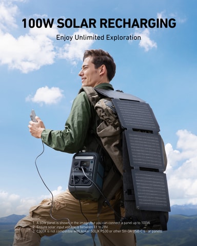 Anker Solix C300X -virta-asema tarjoaa 300 W huipputehon, 140 W kaksisuuntaisen pikalatauksen ja sisältää AC230V- ja DC12V-pistorasiat. Sen mukana toimitetaan 60 W aurinkopaneeli kestävän energian tuottamiseksi.Tutustu ominaisuuksiin