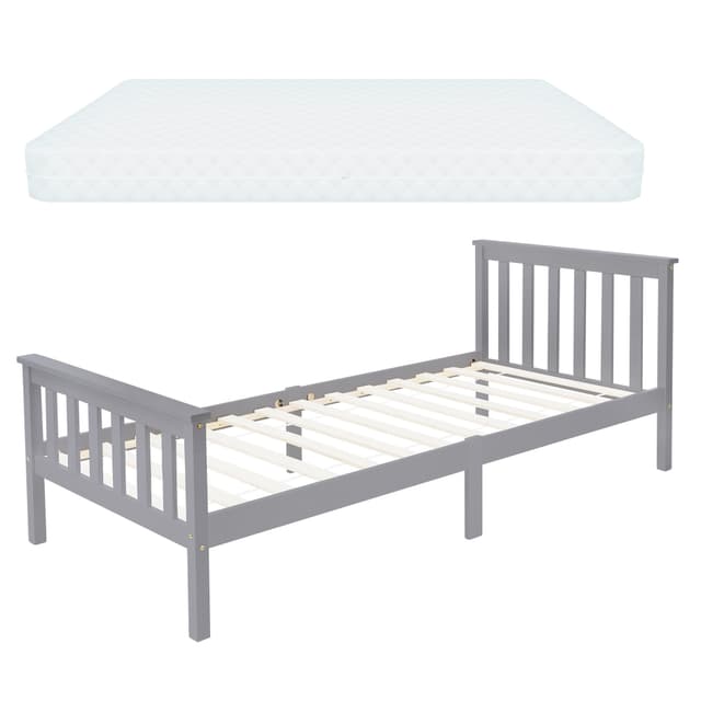 Vaaleanharmaa sänky, jossa on pääty ja jalkataso.