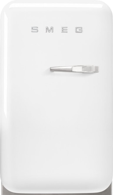 Smeg-jääkaappi FAB5LWH6, tyylikäs valkoinen 40,4 cm kompakti jääkaappi, jossa on kaksi hyllyä, säädettävät jalat ja hiljainen 36 dB:n käyntiääni, sopii täydellisesti tyylikkääseen ja tehokkaaseen jäähdytykseen pienissä tiloissa.Tutustu ominaisuuksiin