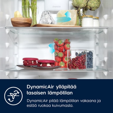 DynamicAir-teknologia luo kylmän ilmavirtauksen jääkaapin kaikkiin osiin varmistaen tasaisen lämpötilan. Säilyttää elintarvikkeiden koostumuksen ja estää niiden kuivumisen.