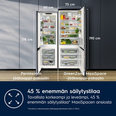 MaxiSpace tarjoaa 45 % enemmän säilytystilaa kuin tavallinen jääkaappipakastin.* Se on vakiomalleja korkeampi ja leveämpi, joten siinä on runsaasti tilaa elintarvikkeille. *Vakiokokoiseen jääkaappipakastimeemme verrattuna