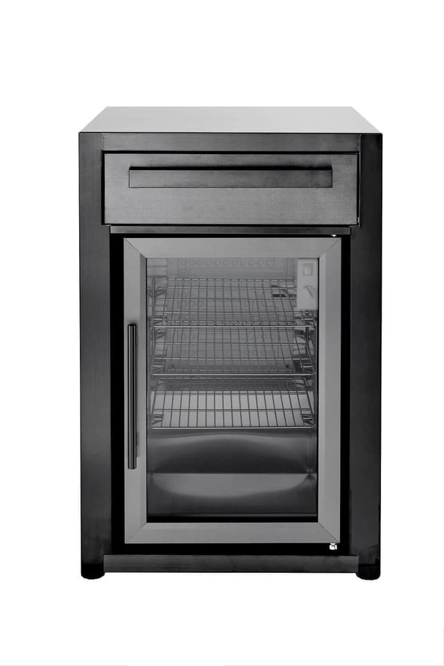 Tyylikäs musta jääkaappi säilytyslaatikolla. Jääkaapilla voit hyödyntää ulkokeittiön kaikki mahdollisuudet samalla, kun se helpottaa valmisteluita ulkona ja pitää ruokasi ja juomasi kylminä ennen tarjoilua. Jääkaappi kuuluu Myoutdoorkitchenin joustavaan ja rakennettavaan moduulisarjaan Nordic Line. Hyvä grillausolut tulee suoraan ulkokeittiöstä!