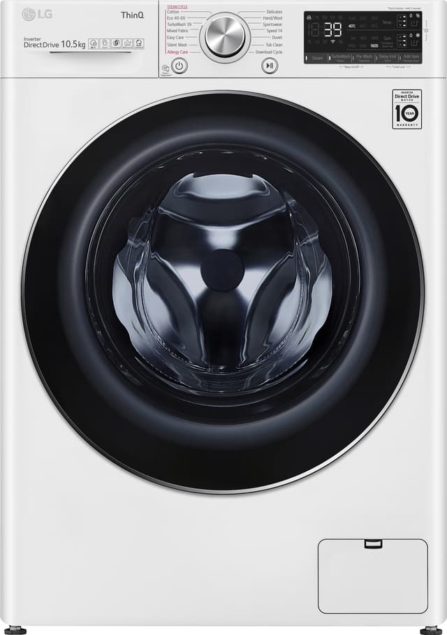 LG-pyykinpesukone tarjoaa erinomaiset pesutulokset ja hellävaraisen huollon vaatteillesi. Laitteen ominaisuuksiin lukeutuu muun muassa 10,5 kg täyttömäärä, DirectDrive-moottori ja AutoDose-järjestelmä. Lisäksi laite on varustettu 14 pesuohjelmalla, joihin lukeutuu myös Steam+- ja TurboWash-valinnat.