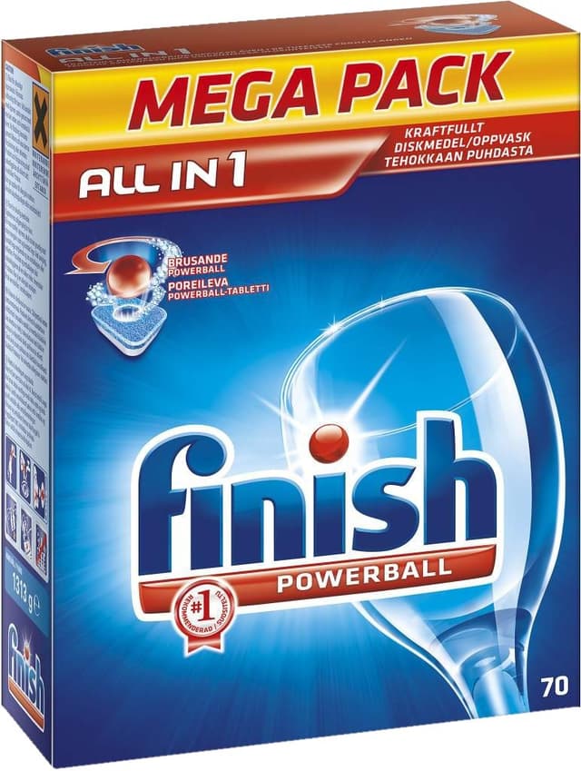 Finish Powerball on tehokas astianpesutabletti astianpesukoneisiin, joihin sopii all-in-1 -tabletit. Tabletit positavat tehokkaasti sitkeimmätkin tahrat.