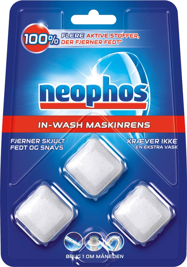 Neophos-koneenpuhdistaja auttaa irrottamaan rasvaa ja puhdistamaan astianpesukoneen sisältä. Käytä puhdistusainetta kerran kuukaudessa astianpesun yhteydessä veden säästämiseksi. Toimii parhaiten All In One -tablettien kanssa. Kolmen kappaleen pakkaus.
