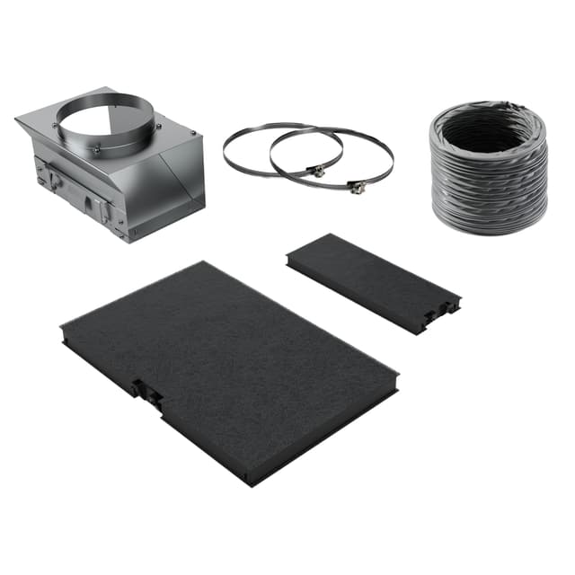 Pidä huolta siitä, että Siemens-liesituulettimesi toimii kunnolla. Pakkaus sisältää 2 aktiivihiilisuodatinta, joustavan putken, ilmanohjaimen sekä kiinnikkeet.