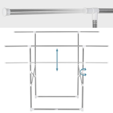 Tämä joustava vaateteline näyttää aina hyvältä riippumatta siitä, onko se sijoitettu makuuhuoneeseen, olohuoneeseen, kerhohuoneeseen vai toimistoon. Kahden vaatetangon korkeutta voidaan säätää yksilöllisesti, jotta erityisesti pidemmät vaatekappaleet pysyvät säilytyksen aikana puhtaina liasta ja rypyistä. Asennus onnistuu muutamalla askeleella salamannopeasti. Yksinkertaisessa ja tilaa säästävässä vaatetelineessä on optimaalinen muotoilu.
