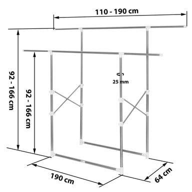 Tekniset tiedot • Kokonaismitat (LxSxK): 190 x 64 x 166 cm • Pidennyskelpoinen: 110 - 190 cm • Korkeussäädettävä: 92 - 166 cm • Korkeussäädettävä 2. tanko. Tanko: 92 - 166 cm • Kantavuus: 20 kg • Paino: 4,8 kg • Putken halkaisija: 25 mm • Taitettuna: 110 x 16 x 92 cm • Materiaali: ABS-muovi, putket ruostumatonta terästä 430 (USA)