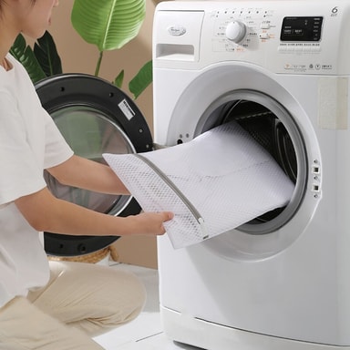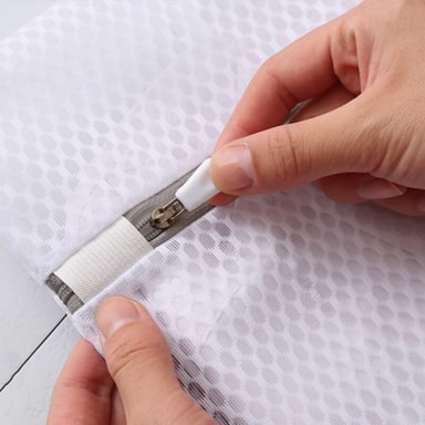 Turvallinen vetoketjukiinnitys: Vetoketju pitää vaatteesi tukevasti pussin sisällä, estäen niitä liukumasta ulos pesun aikana.