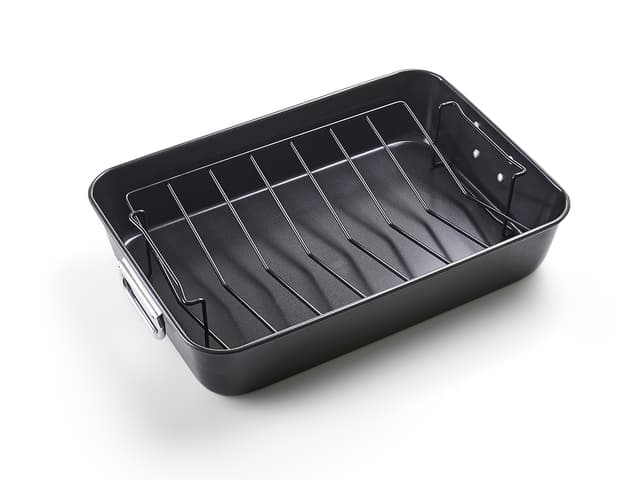 Roasting pan with rack, 40 x 28 cm. Made of carbon steel with internal 2-layer non-stick coating. This allows cooking with less oil/fat as well as easier cleaning.Tutustu ominaisuuksiin
