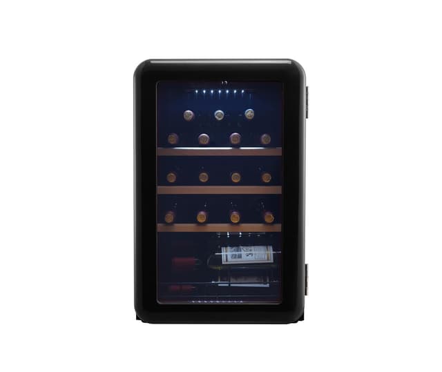 Tämä upouusi malli on tyylikäs yhden lämpötilavyöhykkeen (4–22 °C) retromallinen viinikaappi, jossa on musta lasiovi UV-suojatulla lasilla ja tilaa 19 Bordeaux-pullolle.