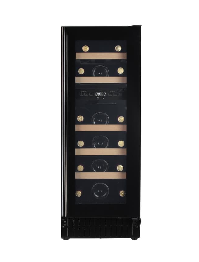 Skandinaavisen Cavinin moderni sisäänrakennettava viinikaappi mustaa lasia. 30 cm leveä viinikaappi on helppo asentaa keittiön työtason alle, ja kosketusnäytön ja näytön ansiosta voit helposti asettaa haluamasi lämpötilan viinikaapin kahteen lämpötila-alueeseen. Scandinavian Collection 30:ssä on tilaa 18 pullolle, ja siinä on kompressorijäähdytys, UV-suojattu lasiovi ja ulosvedettävät puuhyllyt.